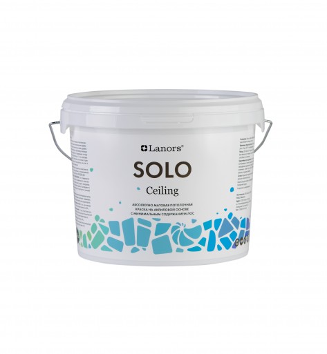 Solo Сeiling Абсолютно матовая потолочная краска на стирол-акриловой основе. Краска отличается высоким укрывом. При нанесении образует равномерную матовую бархатистую поверхность. Выдерживает легкую сухую чистку. Степень блеска - 3 глосс, матовая. Рекомендован к нанесению на по-толки в сухих помещениях, может использоваться для стен в мало проходных помещениях.